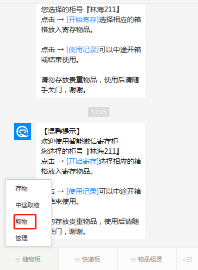 取物時,掃屏幕二維碼進入公眾號內(nèi),點擊“取物”按鈕(如圖1-3所示),點擊“取物”按鈕后,將出現(xiàn)如圖1-4所示界面,客戶可以根據(jù)需求點擊“中途取物”或者“結(jié)束訂單”,點擊“結(jié)束訂單”后,箱門打開,請取走所有物品。點擊“中途取物”后,此箱門還屬客戶,客戶還可以繼續(xù)存物或者取物。