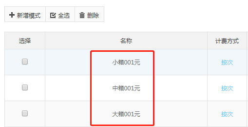 這里我們以設(shè)置的三種收費模式(分別為“大箱 001”、“中箱 001”、“小箱