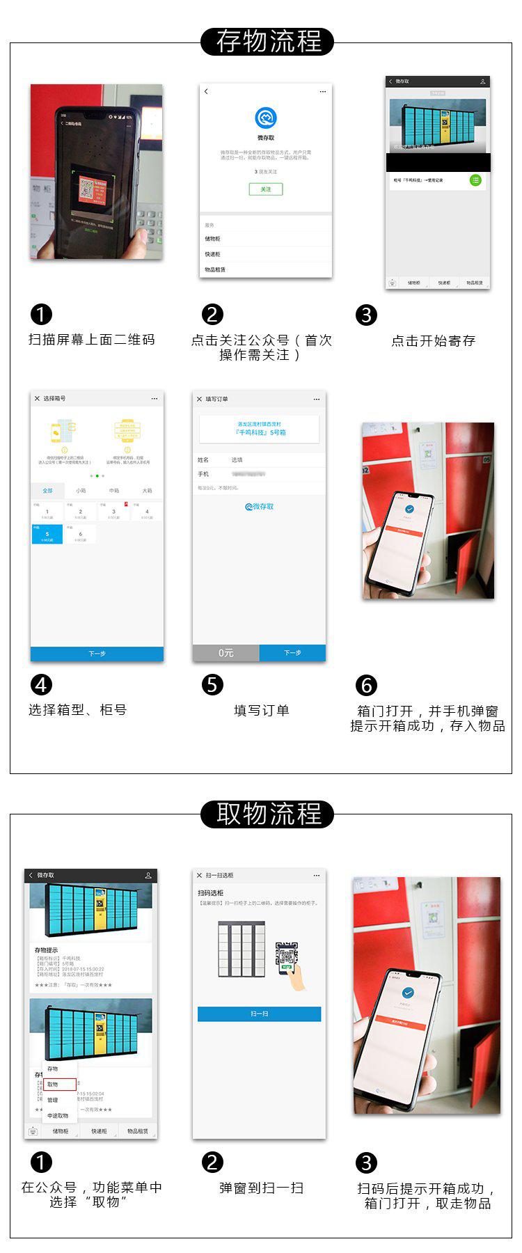 1)使用人在使用微信柜時,首次使用需打開微信掃一掃,掃屏幕二維碼碼關(guān)注公眾號,關(guān)注后進入公眾號內(nèi),點擊“存物”菜單(如圖1-1),掃碼選柜。
