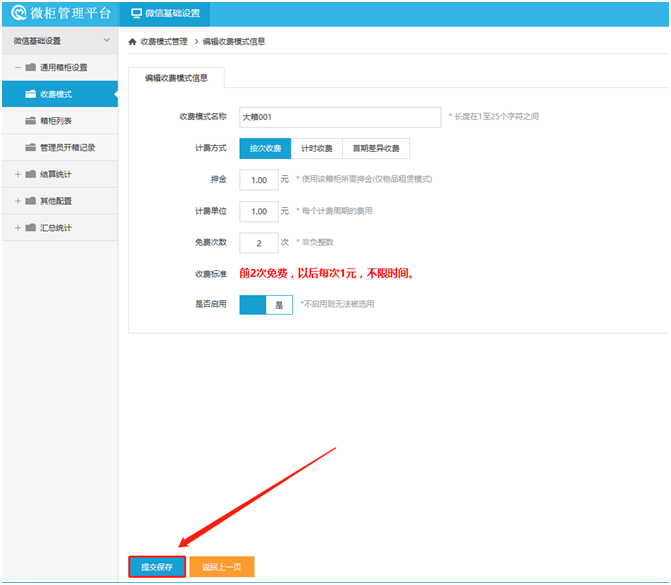 ○3 設(shè)置完之后“提交保存”即可(這里我們設(shè)置全部箱門收費模式為“大箱001